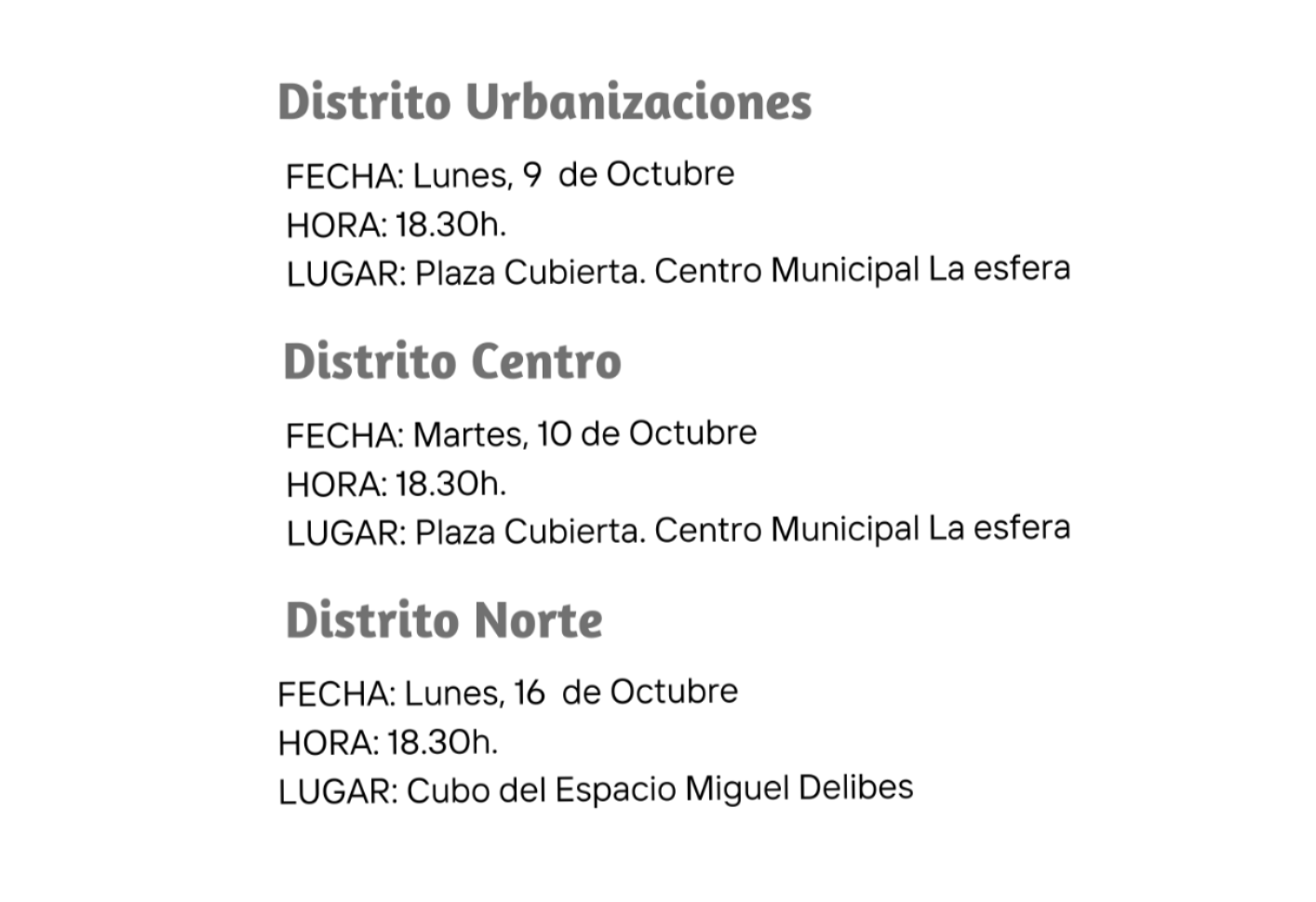 Si eres vecino o vecina de Alcobendas y tienes una idea para tu Distrito, participa en las asambleas con tus propuestas donde además podrás elegir a los y las representantes vecinales que llevarán la voz del distrito a los distintos espacios de participación. |